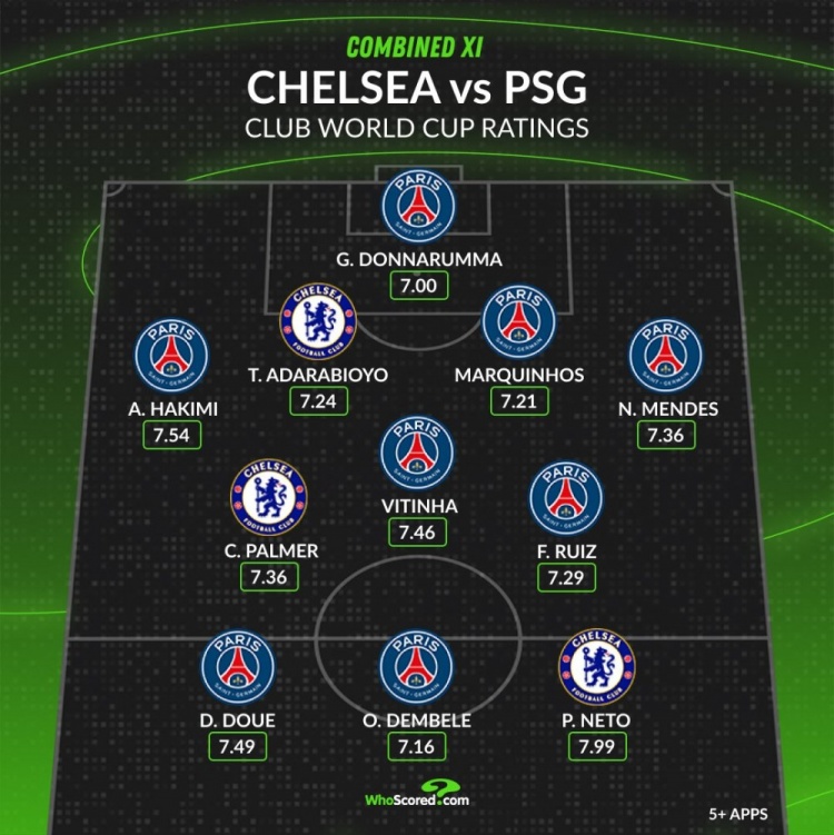 7月13日讯 本届世俱杯仅剩巴黎vs切尔西的决赛,数据机构whoscored也统计了两队球员在本届世俱杯的场均评分,并列出一套合体最佳阵。